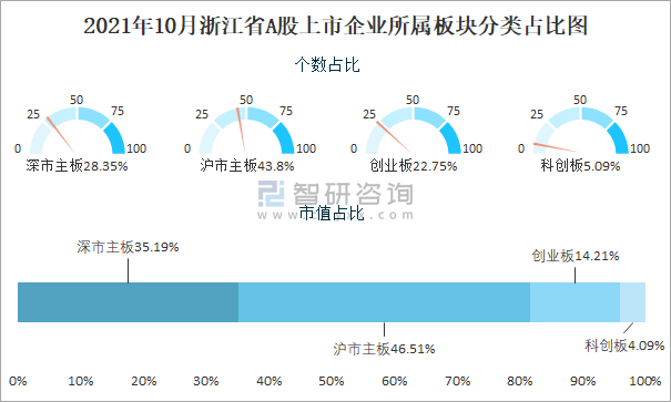 2021年10月浙江省A股上市企業(yè)所屬板塊分類占比圖