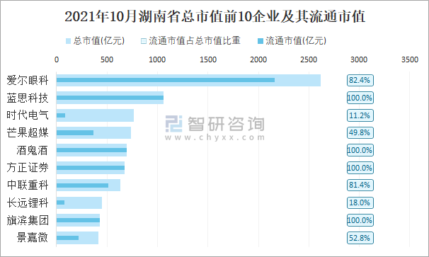 據同花順統計數據可知:截止至2021年10月31日,湖南省總市值最高的企業是愛爾眼科,主要從事醫療服務行業,總市值為2620億元,其流通市值占總市值比重為82.44%;總市值排名前10的企業市值共計8473億元,占全省總市值的45.64%。