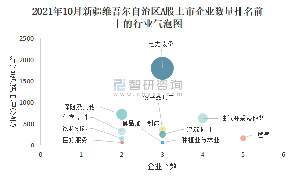 2021年10月新疆維吾爾自治區A股上市企業數量排名前十的行業氣泡圖