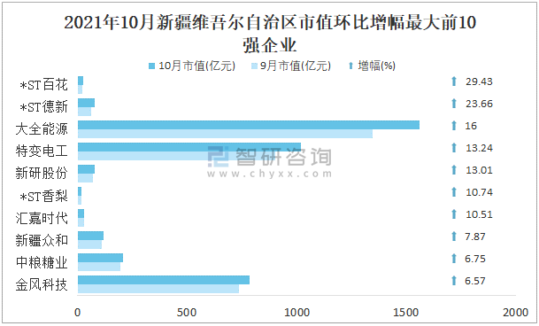 據同花順統計數據可知:相較于2021年9月,新疆維吾爾自治區10月有16家企業總市值呈現不同程度的增長,其增幅均低于50%,其中從事醫療服務行業的*ST百花增幅最大,增長29.43%,環比增幅最大的前10強企業中,從事電力設備行業的大全能源增量最大,總市值增加215.19億元;42家企業總市值環比出現下滑。