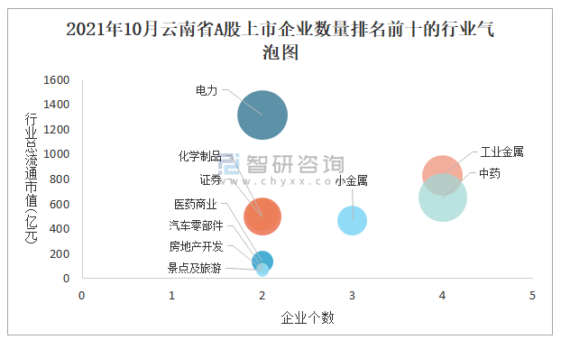 2021年10月云南省A股上市企業數量排名前十的行業氣泡圖