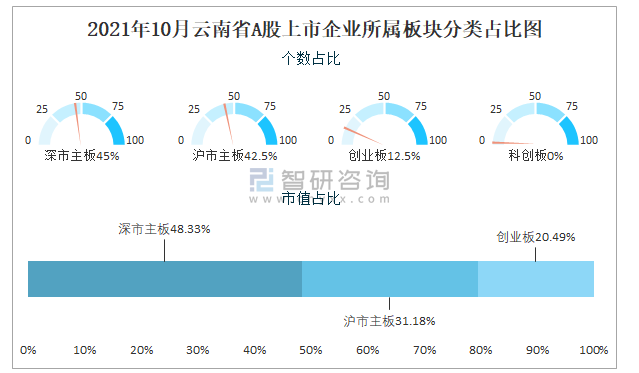 2021年10月云南省A股上市企業所屬板塊分類占比圖