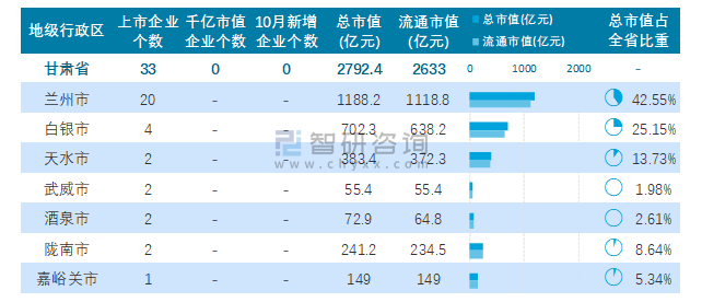 據同花順統計數據可知:截止至2021年10月31日,甘肅省的A股上市企業共計33家,上市企業數量排名全國第26,總市值共計2792.4億元;除慶陽市、張掖市、定西市、平涼市、臨夏回族自治州、金昌市、甘南州7個地級行政區以外,甘肅省其他7個地級行政區均有企業在A股上市,其中蘭州市上市企業數量最多,為20家;甘肅省暫無千億市值企業,蘭州市A股上市企業總市值和總流通市值均為最高。