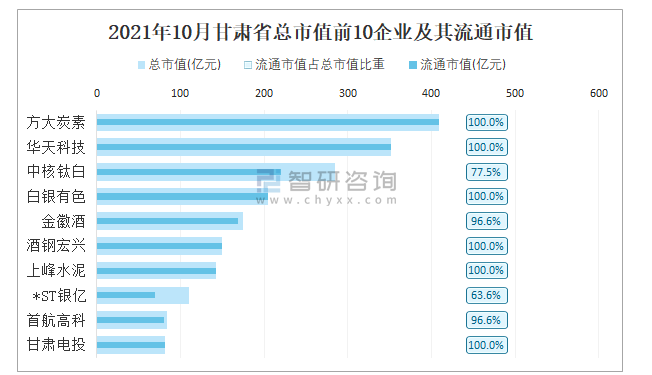 據同花順統計數據可知:截止至2021年10月31日,甘肅省總市值最高的企業是方大炭素,主要從事鋼鐵行業,總市值為409億元,其流通市值占總市值比重為100%;總市值排名前10的企業市值共計1989.2億元,占全省總市值的71.24%。