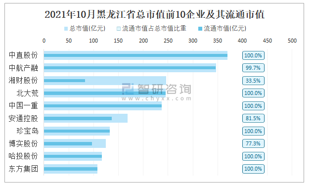 2021年10月黑龍江省總市值前10企業及其流通市值