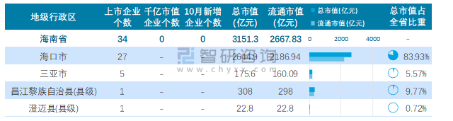 2021年10月海南省34家A股上市企業總市值3151.3億元,海口市上市企業最多