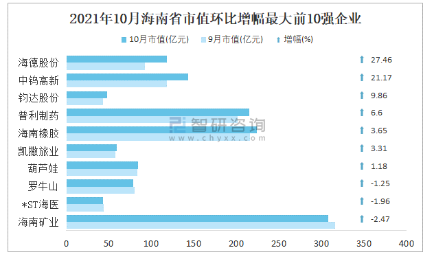 2021年10月海南省市值環比增幅最大前10強企業