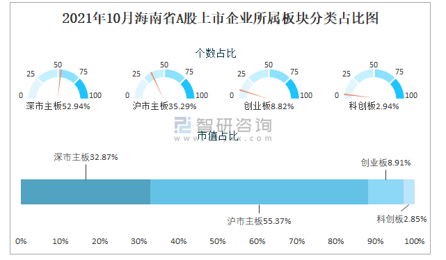 2021年10月海南省A股上市企業所屬板塊分類占比圖