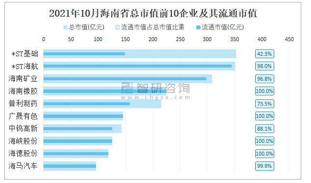 2021年10月海南省總市值前10企業及其流通市值