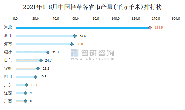 2021年1-8月中國輕革各省市產量排行榜