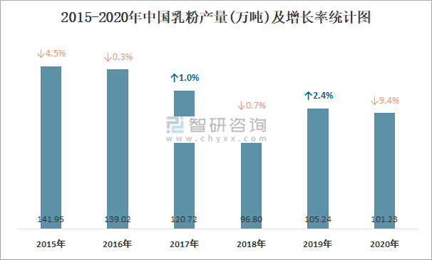 2015-2020年中國乳粉產量及增長率統計圖