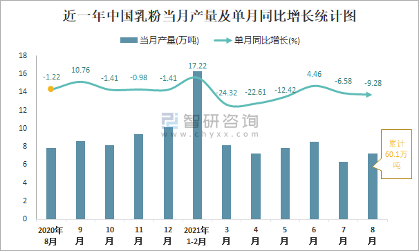 根據國家統計局數據顯示:2021年8月中國乳粉產量為7.2萬噸,同比下降9.28%;2021年1-8月中國乳粉累計產量為60.1萬噸,同比下降6.64%;2015-2020年中國乳粉產量2018年跌至最低值,次年有所回升。