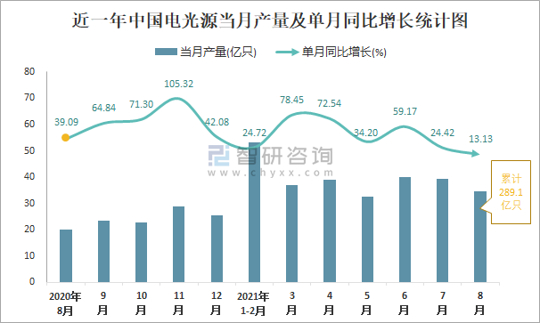 根據(jù)國家統(tǒng)計局數(shù)據(jù)顯示:2021年8月中國電光源產(chǎn)量為34.6億只,同比增長13.13%;2021年1-8月中國電光源累計產(chǎn)量為289.1億只,同比增長63.56%;2015-2020年中國電光源產(chǎn)量2019年跌至最低值,次年大幅度回升。
