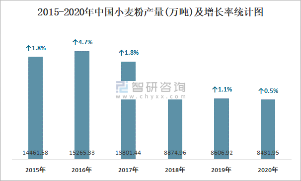 2015-2020年中國小麥粉產(chǎn)量及增長率統(tǒng)計圖