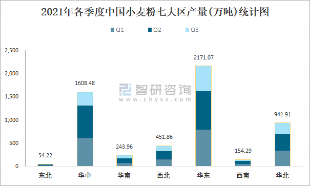 2021年各季度中國小麥粉七大區(qū)產(chǎn)量統(tǒng)計圖