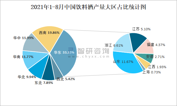 2021年1-8月中國飲料酒產量大區占比統計圖