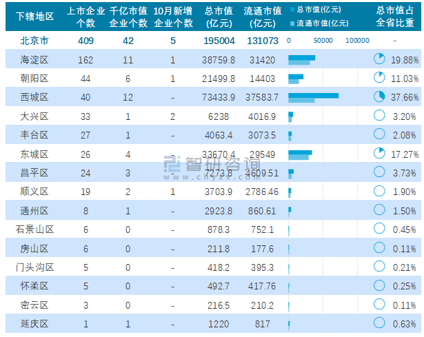 據同花順統計數據可知:10月北京市有5家企業新上市,截止至2021年10月31日,北京市的A股上市企業共計409家,上市企業數量排名全國第4,總市值共計195004.27億元;除平谷區1個市轄區以外,北京市其他15個市轄區均有企業在A股上市,其中海淀區上市企業數量最多,為162家;北京市的A股上市千億市值企業數量在全國排名第1,共計42家,分布在東城區、西城區、朝陽區、豐臺區、海淀區、順義區、通州區、大興區、昌平區、延慶區10個地區,其中西城區千億市值企業最多,為12家;西城區A股上市企業總市值和總流通市值均為最高。