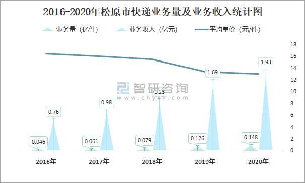 2016-2020年松原市快遞業務量及業務收入統計圖