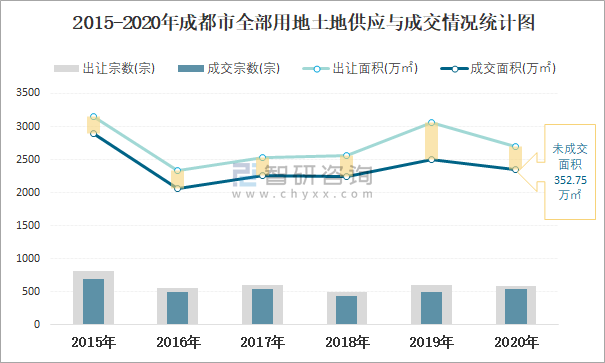 2015-2020年成都市全部用地土地供應與成交情況統計圖
