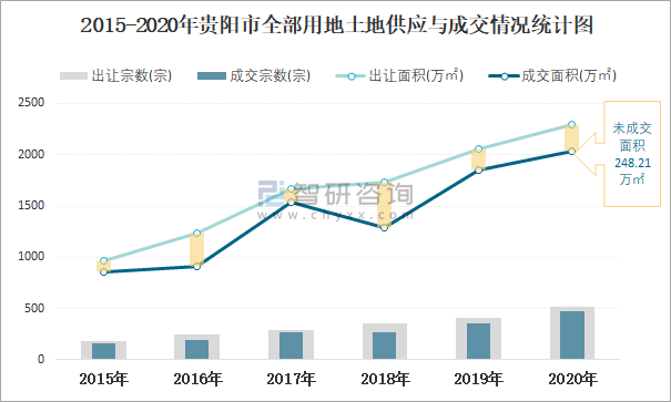 2015-2020年貴陽市全部用地土地供應(yīng)與成交情況統(tǒng)計圖