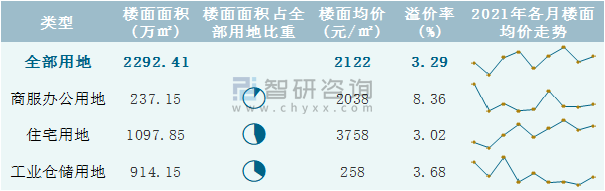 根據(jù)國信房地產(chǎn)信息網(wǎng)數(shù)據(jù)統(tǒng)計可知:2021年9月貴陽市全部用地出讓地面均價為4107元/㎡,其中住宅用地出讓地面均價最高(6685元/㎡),全部用地成交地面均價為6470元/㎡,其中住宅用地成交地面均價為14982元/㎡,高于商服辦公用地成交地面均價;2021年1-9月貴陽市住宅用地樓面面積占其全部用地比重最多,為47.89%,溢價率為3.02%。
