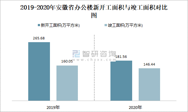 2019-2020年安徽省辦公樓新開(kāi)工面積與竣工面積對(duì)比圖