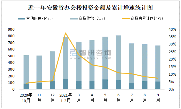 近一年安徽省辦公樓投資金額及累計(jì)增速統(tǒng)計(jì)圖