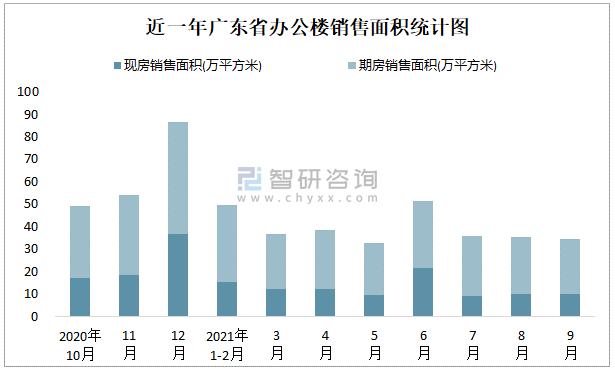 2021年9月廣東省辦公樓銷售面積為34.42萬平方米(現房銷售面積占比29.6%)