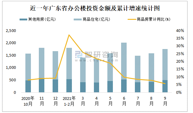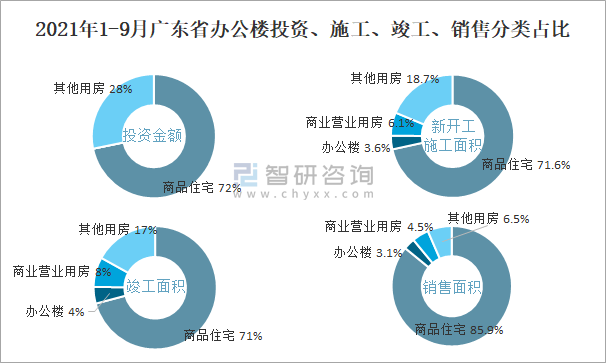 根據國家統計局數據統計可知:2021年1-9月廣東省房地產開發企業在包括辦公樓在內的其他用房投資金額占比為28.2%(注:只有投資金額中其他用房包含辦公樓、商業營業用房),辦公樓的新開工面積與竣工面積所占比重差異不大,從銷售面積來看,辦公樓銷售面積占比少于商業營業用房銷售面積占比。