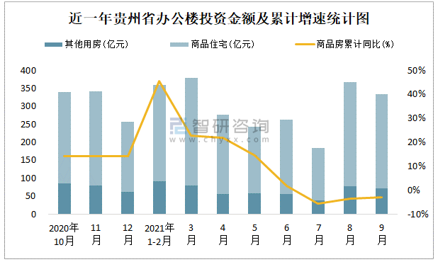 根據國家統計局數據統計可知:2021年9月貴州省房地產開發投資商品房投資金額為332.69億元,其中包括辦公樓、商業營業用房等其他用房72.23億元(注:辦公樓、商業營業用房未分開統計);2021年1-9月貴州省房地產開發投資包括辦公樓在內的其他用房累計金額為528.36億元。