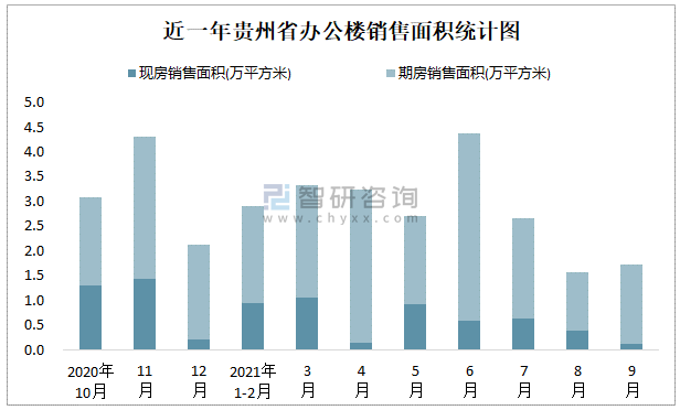 根據國家統計局數據可知:2021年9月貴州省辦公樓銷售面積為1.72萬平方米(其中銷售現房0.13萬平方米,期房1.59萬平方米);2021年1-9月貴州省辦公樓累計銷售面積為22.48萬平方米;近一年貴州省辦公樓期房銷售面積遠高于現房銷售面積。