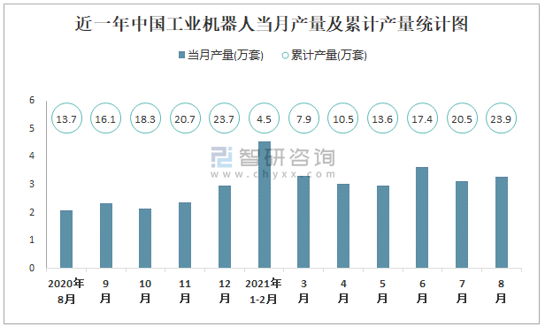 2021年1-8月中國工業機器人產量為23.9萬套 累計增長63.9%