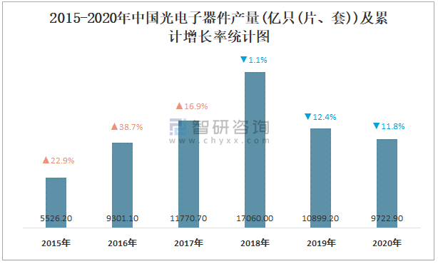 2015-2020年中國光電子器件產(chǎn)量及累計增長率統(tǒng)計圖