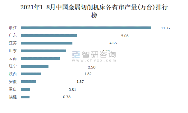 根據國家統計局數據顯示:2021年各季度(第三季度目前暫只統計7月和8月數據)中國金屬切削機床主要集中在華東、華南、西南地區生產;2021年1-8月中國金屬切削機床產量大區分布不均衡,其中華東地區產量最高,特別是浙江省貢獻了最多產量;2021年1-8月中國金屬切削機床各省市產量top1遙遙領先于其他前9名。