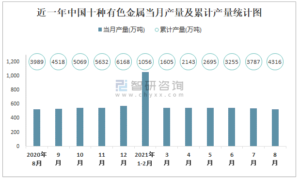 近一年中國十種有色金屬當月產量及累計產量統計圖