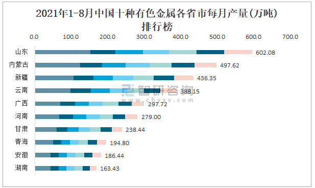 2021年1-8月中國十種有色金屬各省市每月產量排行榜