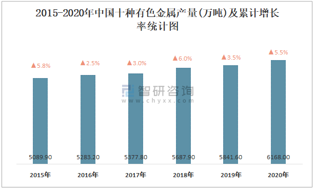 2015-2020年中國十種有色金屬產量及累計增長率統計圖