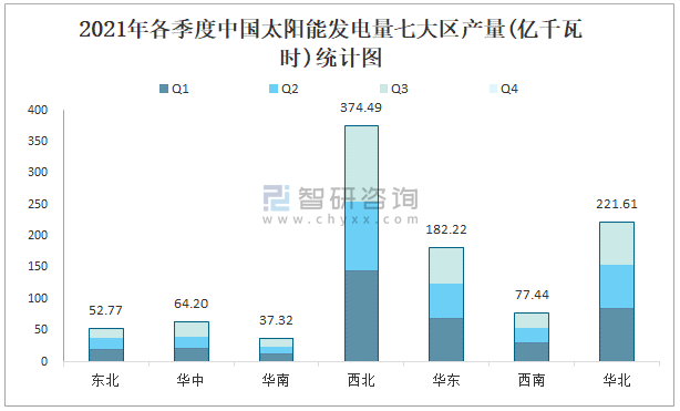 2021年各季度中國太陽能發電量七大區產量統計圖