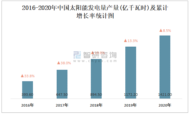 2016-2020年中國太陽能發電量產量及累計增長率統計圖