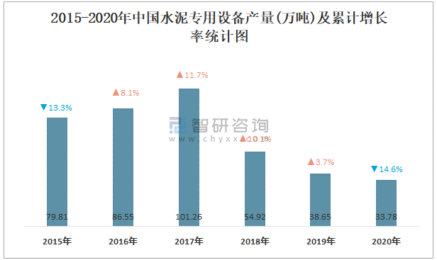 2015-2020年中國水泥專用設(shè)備產(chǎn)量及累計增長率統(tǒng)計圖