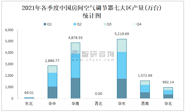 2021年各季度中國房間空氣調節器七大區產量統計圖