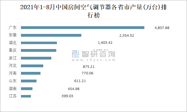 2021年1-8月中國房間空氣調節器各省市產量排行榜