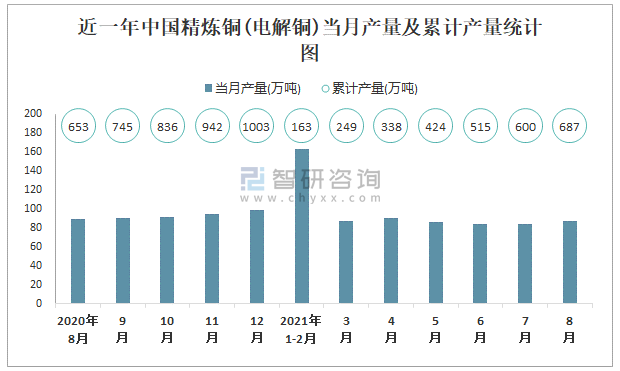 近一年中國精煉銅(電解銅)當月產量及累計產量統計圖