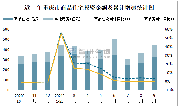 根據(jù)國家統(tǒng)計局?jǐn)?shù)據(jù)統(tǒng)計可知:2021年9月重慶市房地產(chǎn)開發(fā)投資商品房投資金額為447.17億元(其中商品住宅為329.89億元,辦公樓、商業(yè)營業(yè)用房等其他用房117.28億元);2021年1-9月重慶市房地產(chǎn)開發(fā)投資商品住宅累計投資金額為2466.03億元,投資金額累計同比增長3.6%。