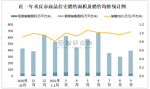 根據(jù)國家統(tǒng)計局?jǐn)?shù)據(jù)可知:2021年9月重慶市商品住宅銷售面積為396.29萬平方米(其中銷售現(xiàn)房36.79萬平方米,期房359.5萬平方米),銷售額為409.84億元,銷售均價約為1.03萬元/平方米;2021年1-9月重慶市商品住宅累計銷售面積為3904.02萬平方米,銷售面積累計同比增長16.3%,累計銷售額為3834.58億元,銷售額累計同比增長32.1%;近一年重慶市商品住宅銷售均價2021年5月達(dá)到最高值,此后有所下滑,期房銷售面積遠(yuǎn)高于現(xiàn)房銷售面積。
