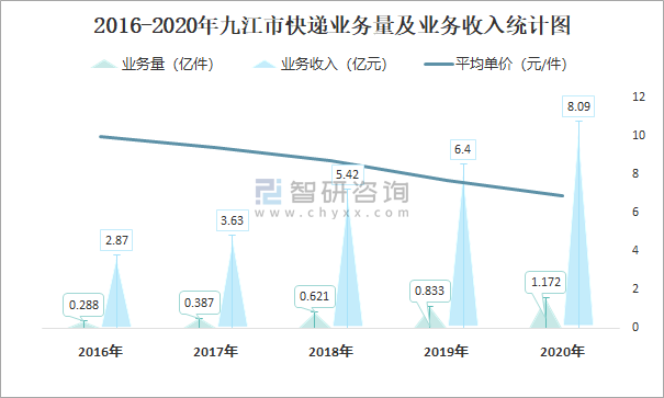 根據各省市郵政局數據可知:2021年8月九江市快遞業務量為957.72萬件,業務收入為7226.01萬元;2021年1-8月九江市快遞累計業務量為7875.82萬件,同比增長48.79%,累計業務收入為55438.62萬元,同比增長30.67%;2016-2020年九江市快遞業務量與業務收入均逐年遞增,平均單價逐年遞減。