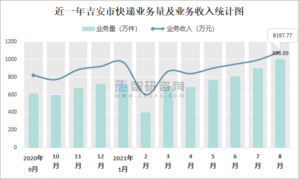 近一年吉安市快遞業(yè)務(wù)量及業(yè)務(wù)收入統(tǒng)計圖