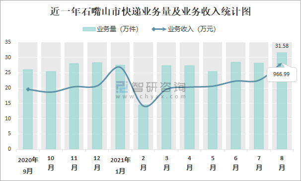 2021年8月石嘴山市快遞業務量與業務收入分別為31.58萬件和966.99萬元