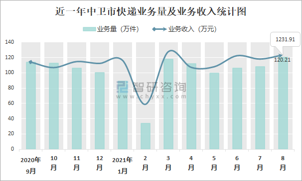 2021年8月中衛(wèi)市快遞業(yè)務(wù)量與業(yè)務(wù)收入分別為120.21萬件和1231.91萬元