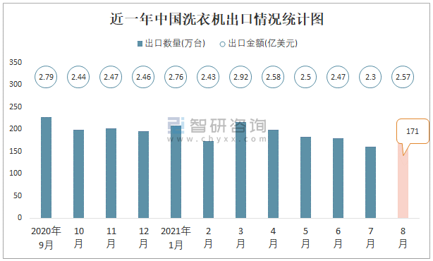 根據(jù)中國海關(guān)數(shù)據(jù)顯示:2021年8月中國洗衣機(jī)出口數(shù)量為171萬臺,同比下降21.5%,出口金額為2.57億美元,同比下降4.1%;2021年1-8月中國洗衣機(jī)出口數(shù)量為1490萬臺,出口金額為20.52億美元。